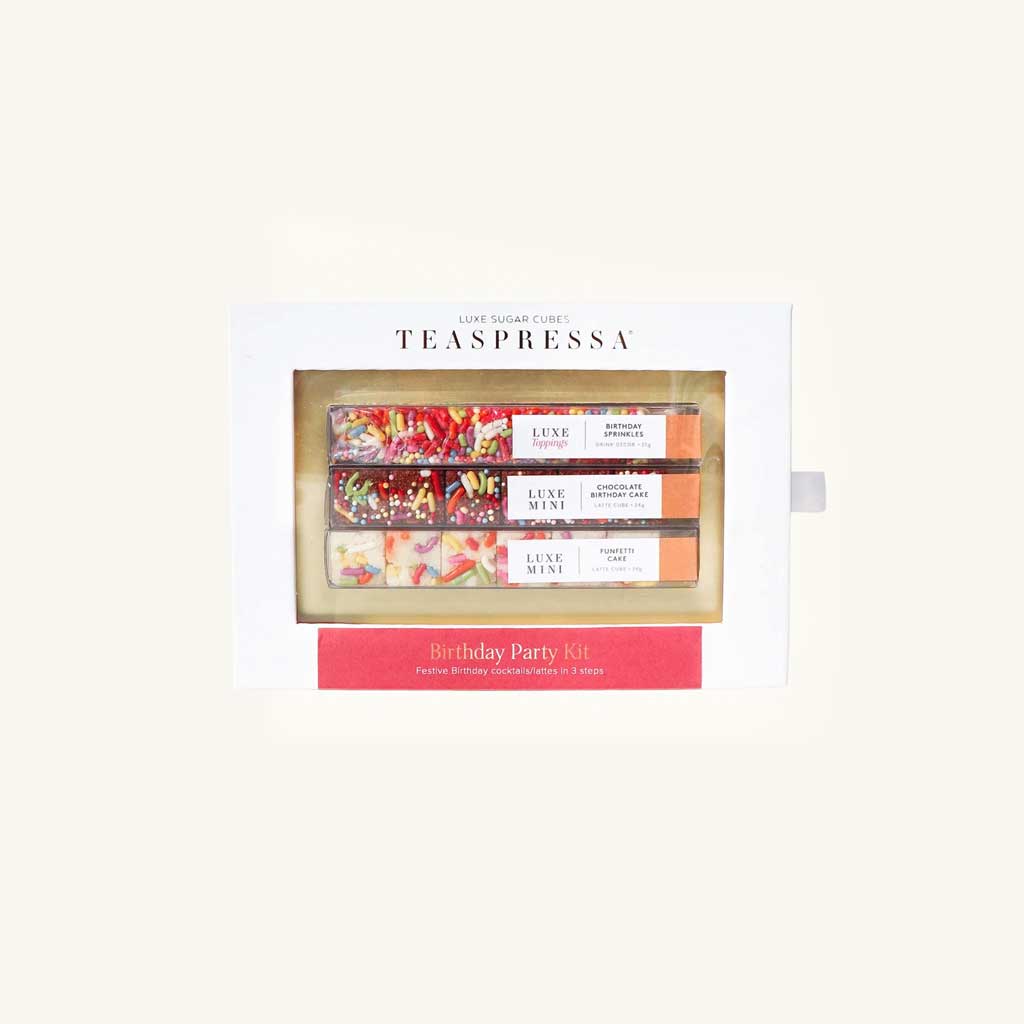 BIRTHDAY LATTE: Saturate 1 LUXE Chocolate Birthday Cube with a splash of hot water, muddle until cube becomes syrup, add 8oz plain latte (tea shot/espresso + steamed milk) or add to cup of tea/coffee with a splash of milk. Garnish with whipped cream and LUXE Sprinkle Toppings. FUNFETTI BIRTHDAY MARTINI: Saturate 1 LUXE Funfetti Cube in 1oz of water, muddle until cube becomes a syrup. Add 2oz of white chocolate liqueur, 1oz of amaretto liqueur, and 2oz of half and half. Shake with ice, strain, and serve in a new glass straight up. Garnish with rimmed LUXE Sprinkles Toppings. CHOCOLATE BIRTHDAY MARTINI: Saturate 1 LUXE Chocolate Birthday Cake Cube in 1oz of water, muddle until cube becomes a syrup. Add 2oz f cake vodka, 2oz of chocolate liqueur, 1oz of hazelnut liqueur, and 2 oz of half and half. Shake with ice, strain, and serve in a new glass straight up. Garnish with chocolate syrup, chocolate shavings, and LUXE Sprinkles Toppings