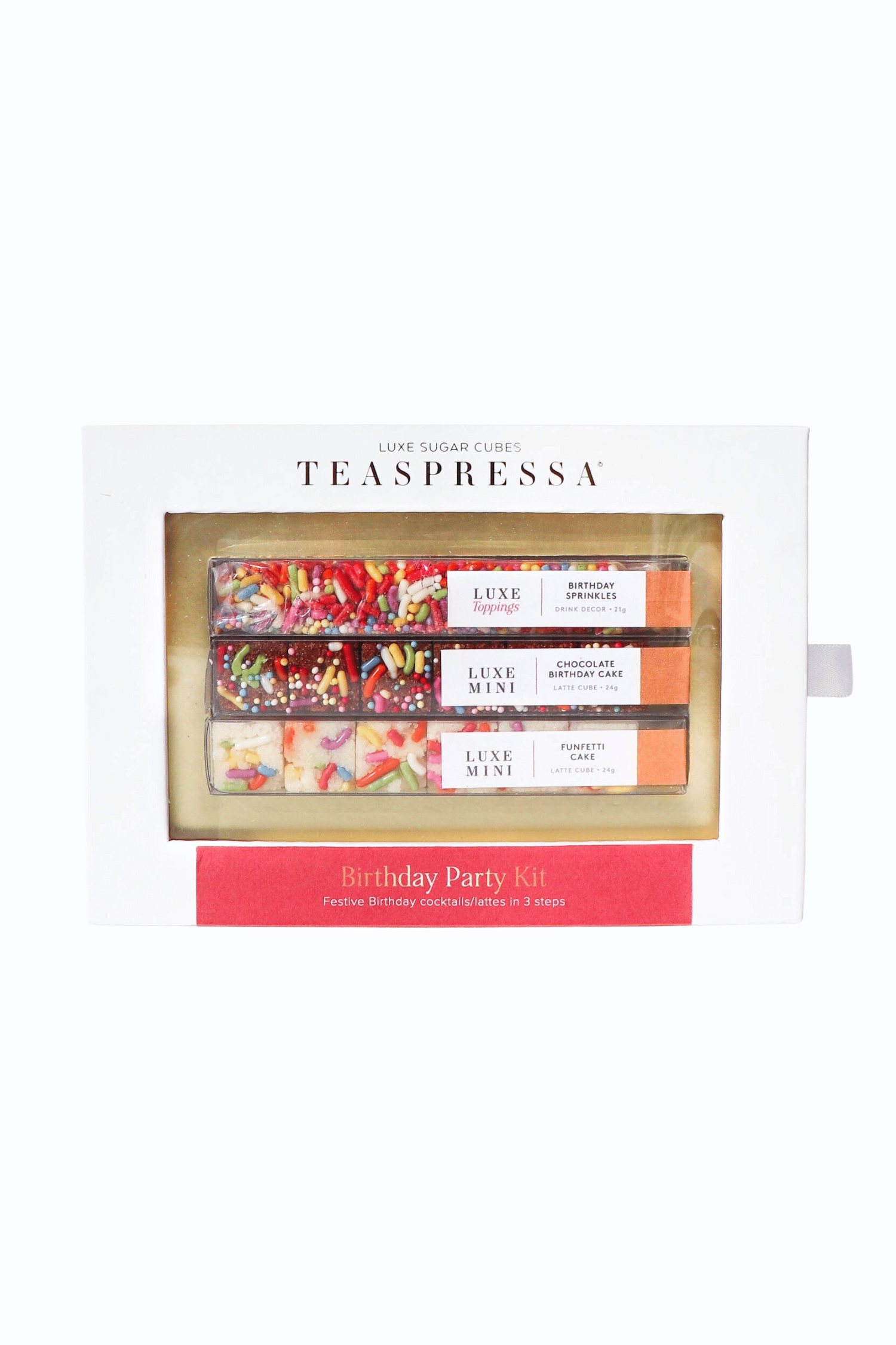 BIRTHDAY LATTE: Saturate 1 LUXE Chocolate Birthday Cube with a splash of hot water, muddle until cube becomes syrup, add 8oz plain latte (tea shot/espresso + steamed milk) or add to cup of tea/coffee with a splash of milk. Garnish with whipped cream and LUXE Sprinkle Toppings. FUNFETTI BIRTHDAY MARTINI: Saturate 1 LUXE Funfetti Cube in 1oz of water, muddle until cube becomes a syrup. Add 2oz of white chocolate liqueur, 1oz of amaretto liqueur, and 2oz of half and half. Shake with ice, strain, and serve in a new glass straight up. Garnish with rimmed LUXE Sprinkles Toppings. CHOCOLATE BIRTHDAY MARTINI: Saturate 1 LUXE Chocolate Birthday Cake Cube in 1oz of water, muddle until cube becomes a syrup. Add 2oz f cake vodka, 2oz of chocolate liqueur, 1oz of hazelnut liqueur, and 2 oz of half and half. Shake with ice, strain, and serve in a new glass straight up. Garnish with chocolate syrup, chocolate shavings, and LUXE Sprinkles Toppings