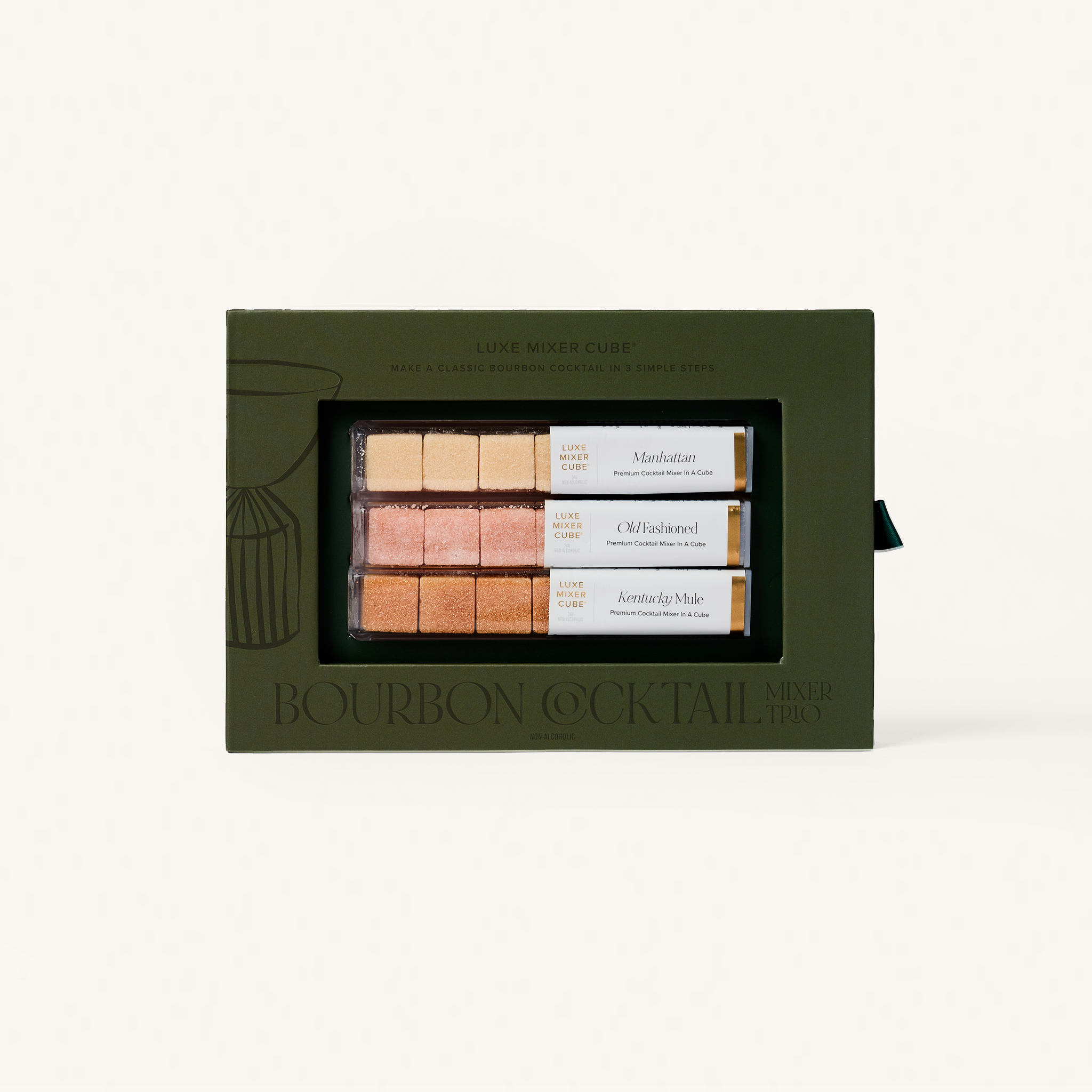 Calling all bourbon and whiskey lovers. This kit is your ticket to effortlessly crafted cocktails, without the fuss. Featuring our signature Luxe Mixer Cubes, designed specifically to pair with your favourite spirits, this collection makes it simple to create balanced, custom cocktails every time. With 15 calories or less per cube, it's the easy, guilt-free way to elevate your sip. From classic Manhattans to Kentucky Mules, just drop in a cube, muddle, and pour your spirit of choice. Want to skip the alcohol? Substitute club soda for the perfect mocktail. The Evergreen Bourbon kit makes up to 18 cocktails—ideal for hosting, gifting, or treating yourself.