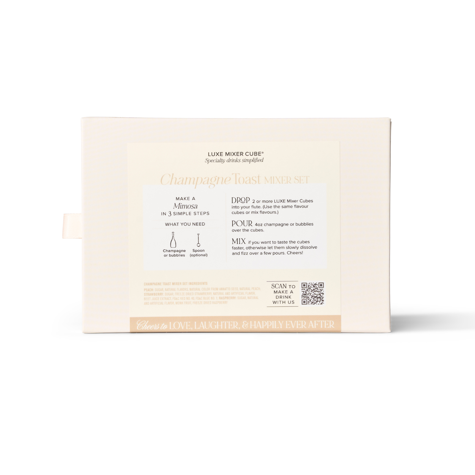 Inside, you'll find our handcrafted LUXE Mixer Cubes, infused with natural flavours that turn champagne into elegant mimosas, mocktails, or artisan-flavoured cocktails. Each LUXE Mixer cube is designed to enhance the taste of your bubbly, making every sip a celebration.