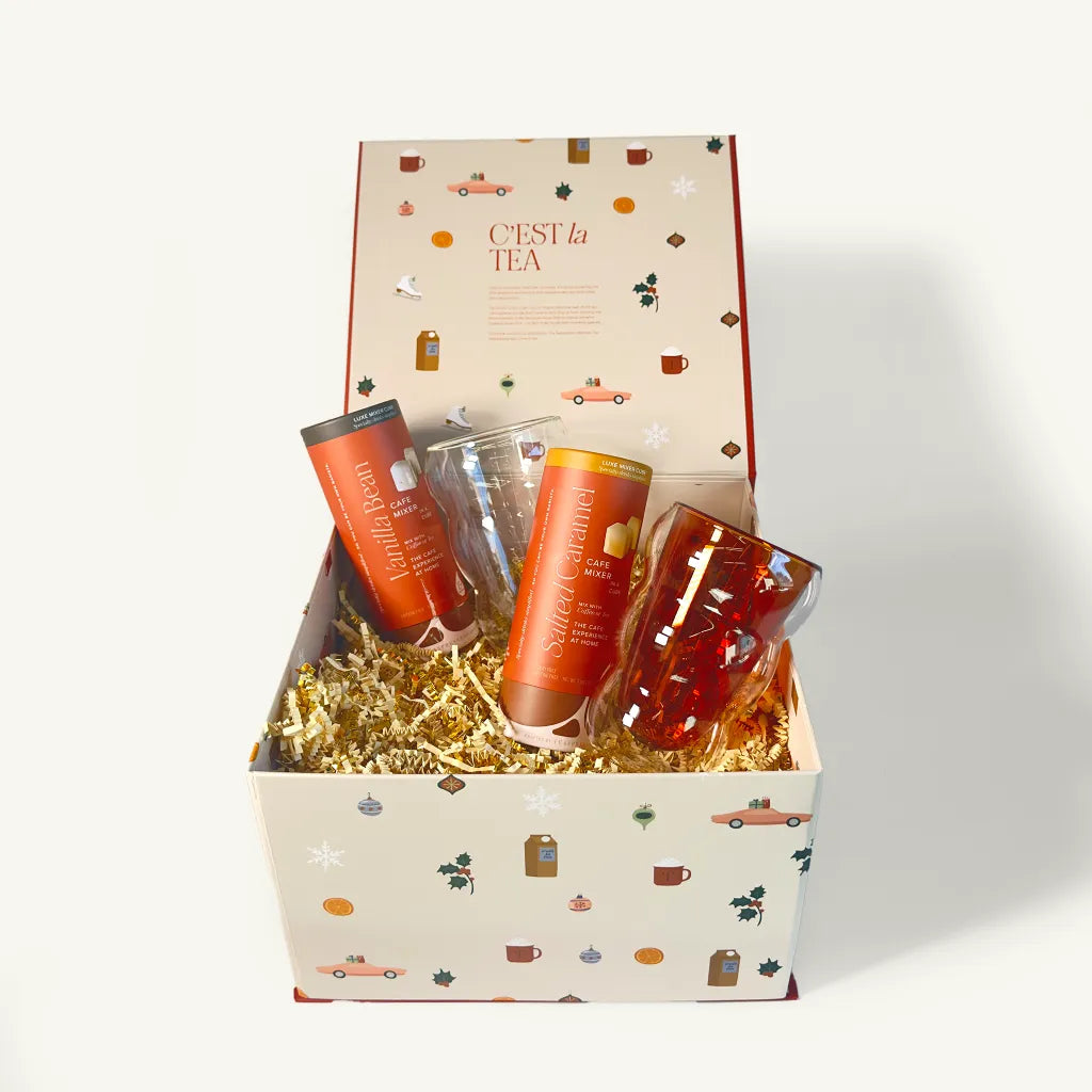 Vanilla Bean Cafe Mixer Tallboy, Salted Caramel Cafe Mixer Tallboy, Pistachio Milk Frother, Two Glass Cloud Cups