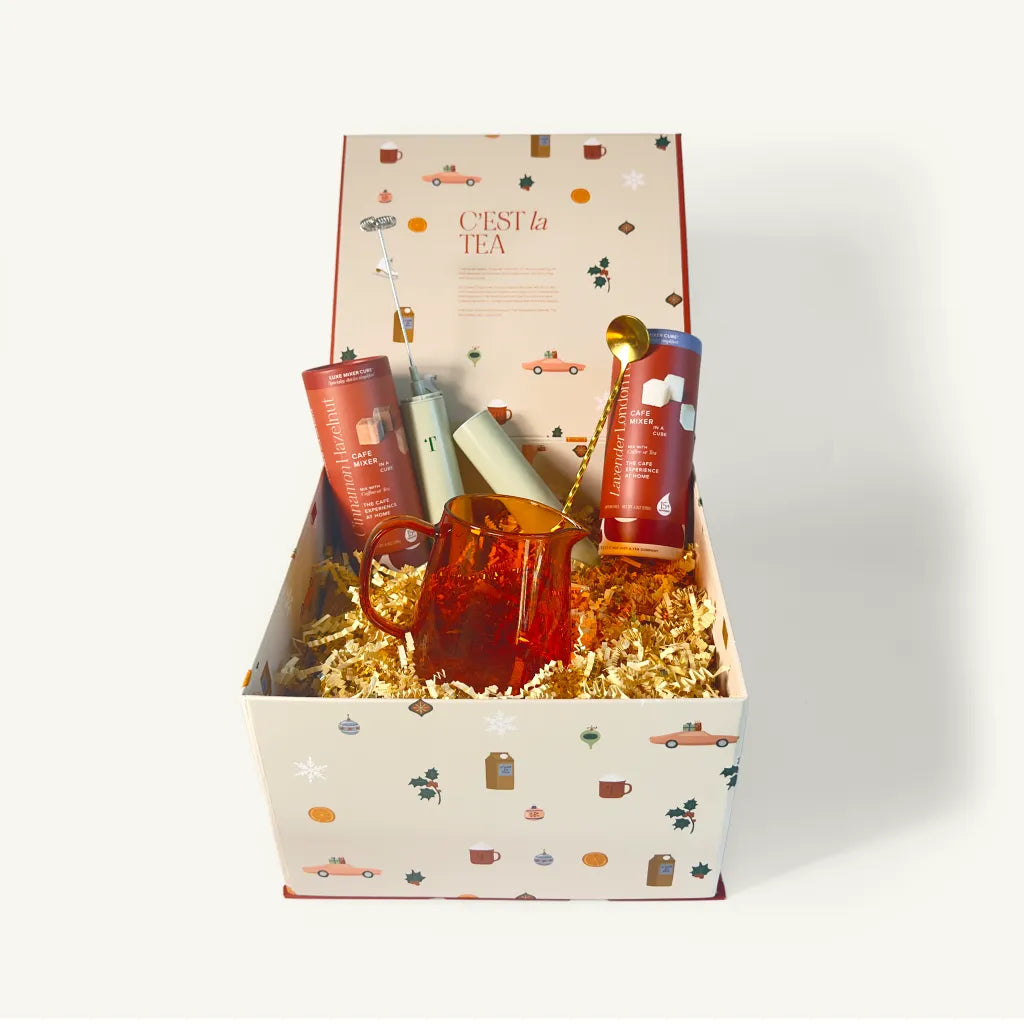 BUNDLE INCLUDES • Cinnamon Hazelnut Café Mixer Tallboy • Lavender London Fog Café Mixer Tallboy • Glass Milk Pitcher • Bar Spoon + Muddler