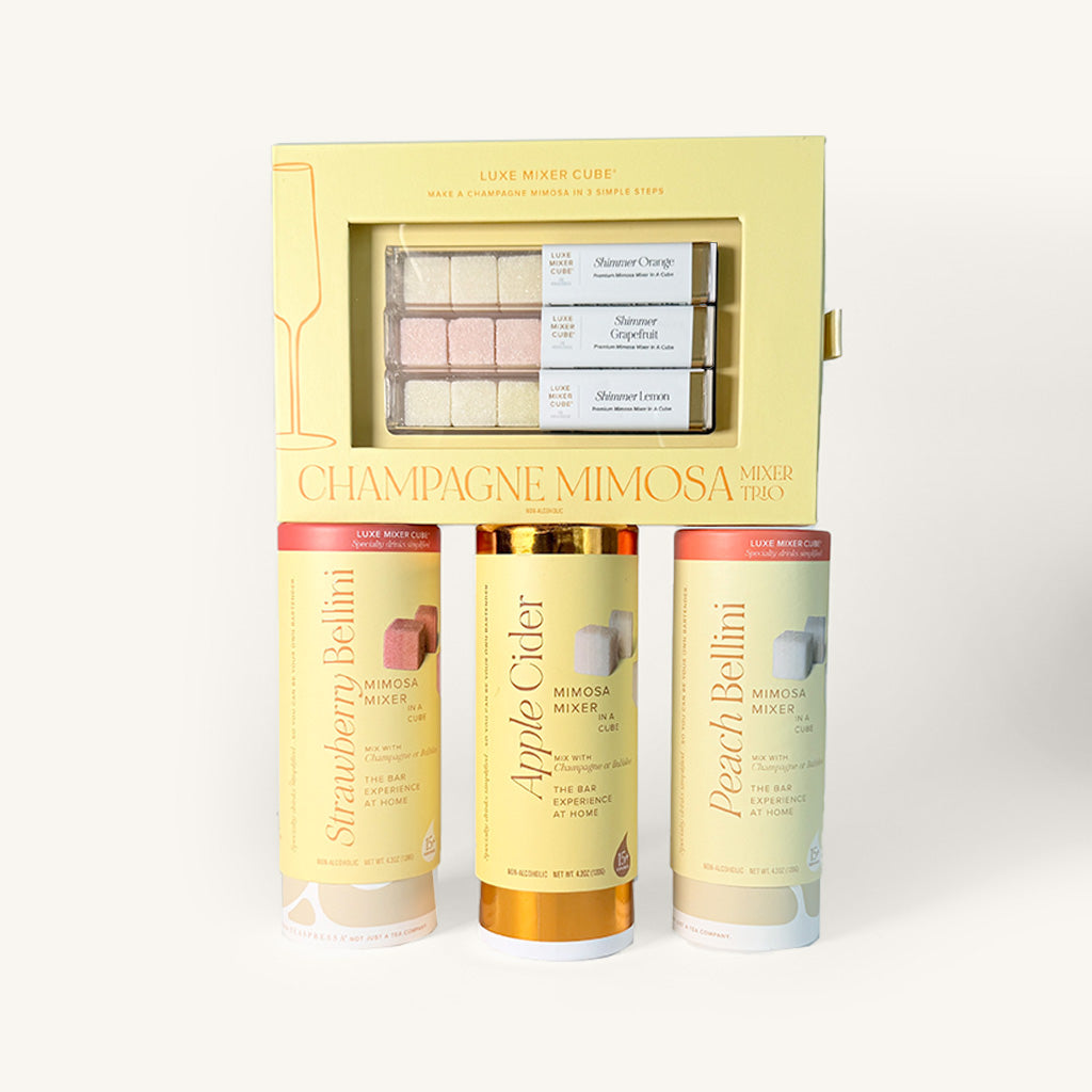 Bundle Includes: • 1 Apple Cider Mimosa Mixer Tallboy • 1 Evergreen Champagne Mimosa Mixer Kit • 1 Peach Bellini Mimosa Mixer Tallboy • 1 Strawberry Bellini Mimosa Mixer Tallboy 15-30 servings in each package. Less than a teaspoon of sugar per LUXE Cube. Approximately 16 calories and 4 carbs. 100% recyclable and biodegradable packaging. Non-alcoholic, gluten-free, kosher, and handmade in the USA.
