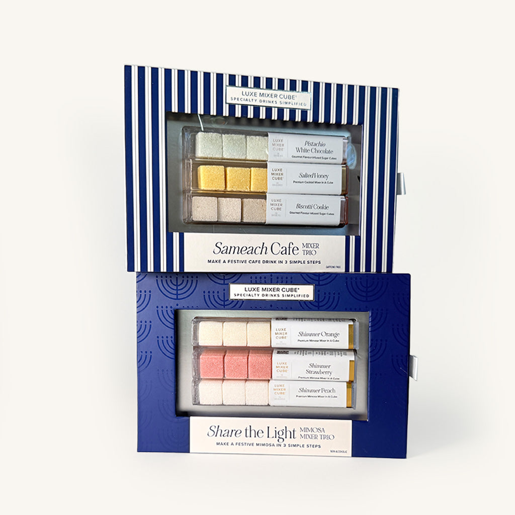 This limited-edition duo combines two luminous trios from our Hanukkah Collection: the Share the Light Mimosa Mixer Trio, featuring Peach, Strawberry, and Orange shimmer cubes to transform sparkling wine into radiant toasts; and the Sameach Café Mixer Trio, blending White Chocolate Pistachio, Biscotti, and Salted Honey cubes for indulgent coffee or tea moments.