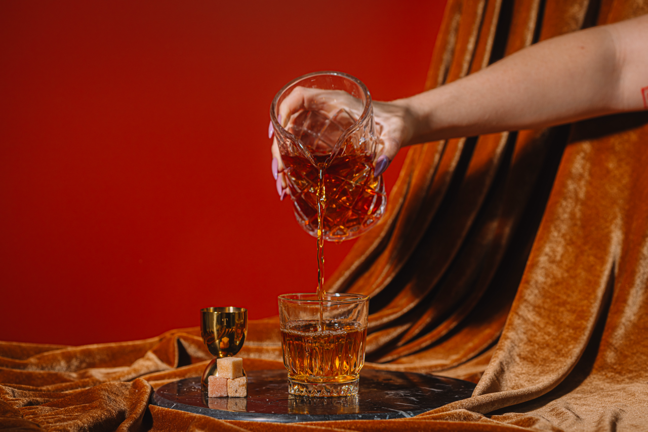 Hand pouring amber liquid from a glass into another glass on a draped fabric background