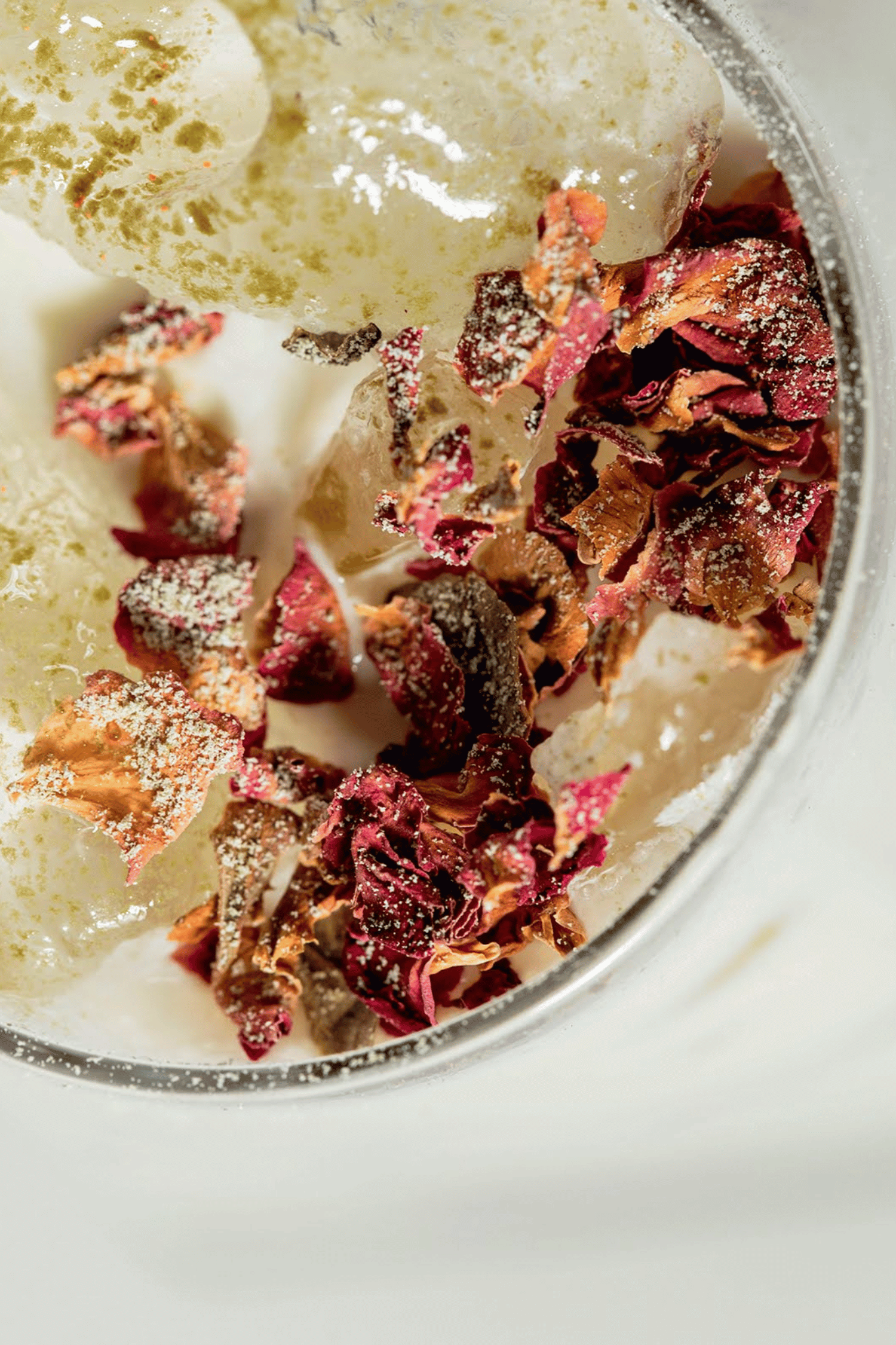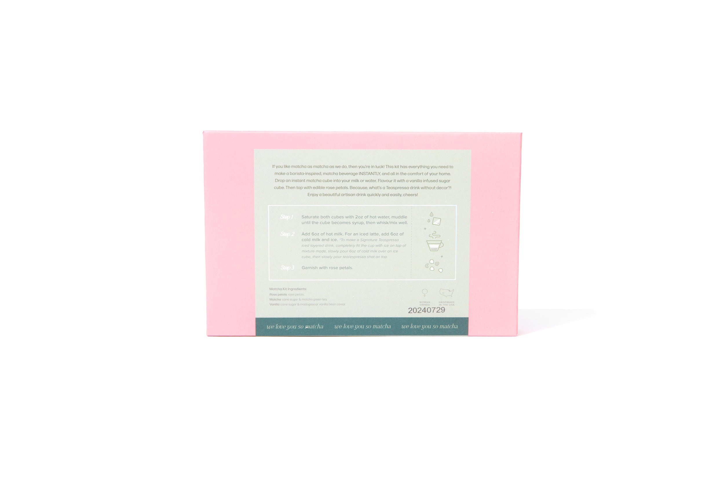 Step 1: Saturate 1 Vanilla and 1 Matcha cube with 2oz of warm water, muddle until the cubes become syrup, then whisk/mix well. Step 2: Add 6oz of hot milk. For an iced latte, add 6oz of cold milk and ice. Step 3: Garnish with rose petals and enjoy!