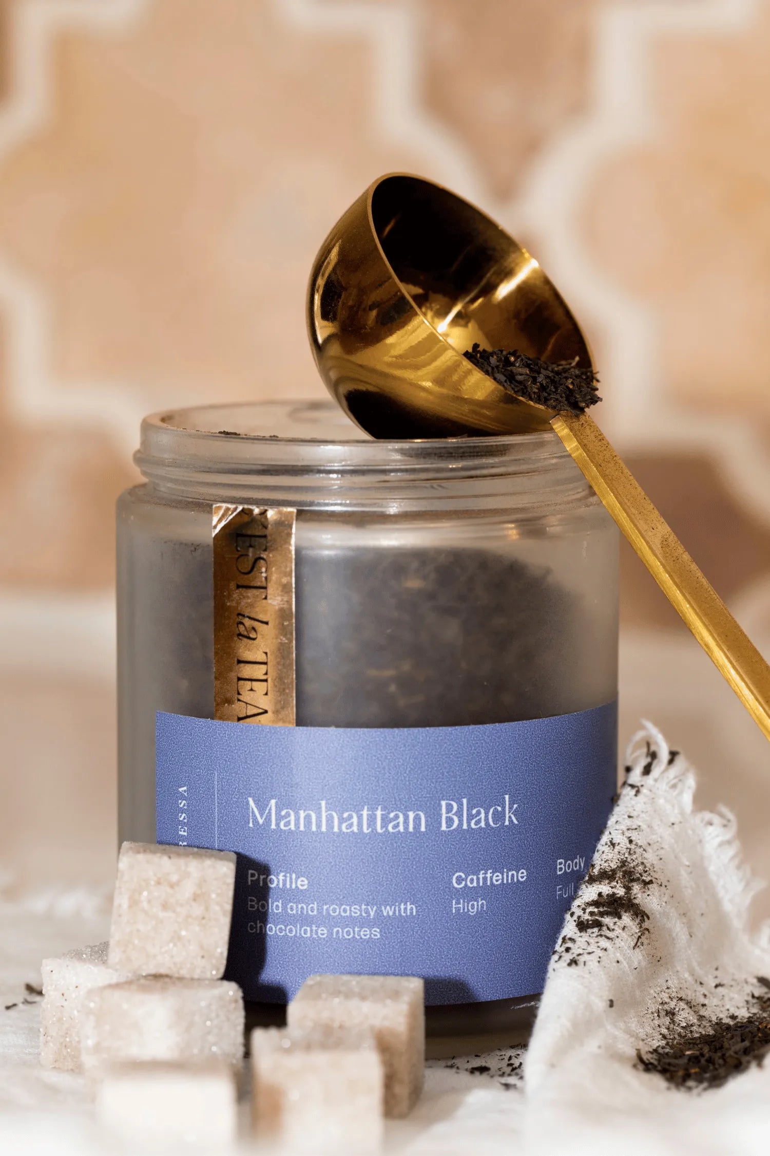 MANHATTAN BLACK: Proprietary organic black tea, German rye. CHARLES GREY: Proprietary organic black tea, natural cornflower petals, natural bergamot flavor. GREEN GOLD: Proprietary organic green tea blend. CAPE TOWN: Proprietary organic Rooibos tea blend (Naturally caffeine-free).